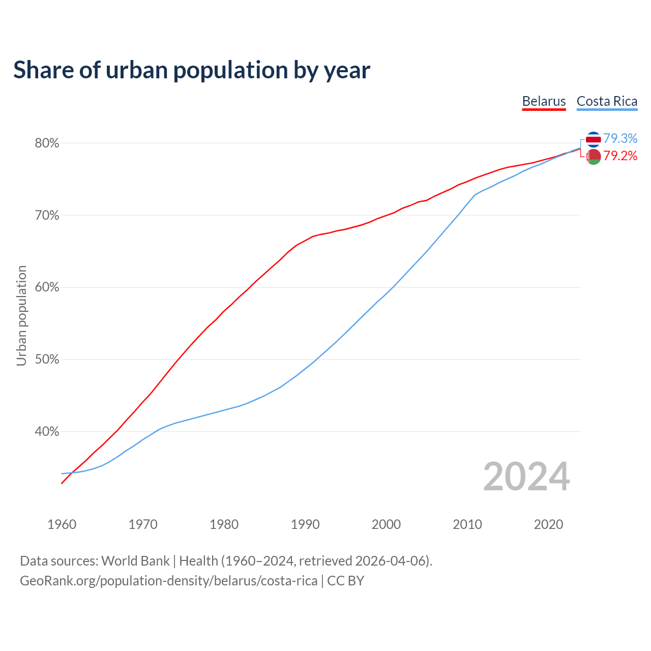 From 2004 to 2024, the share of urban population changed from 71.8% to 79.2% in Belarus and from 63.7% to 79.3% in Costa Rica.