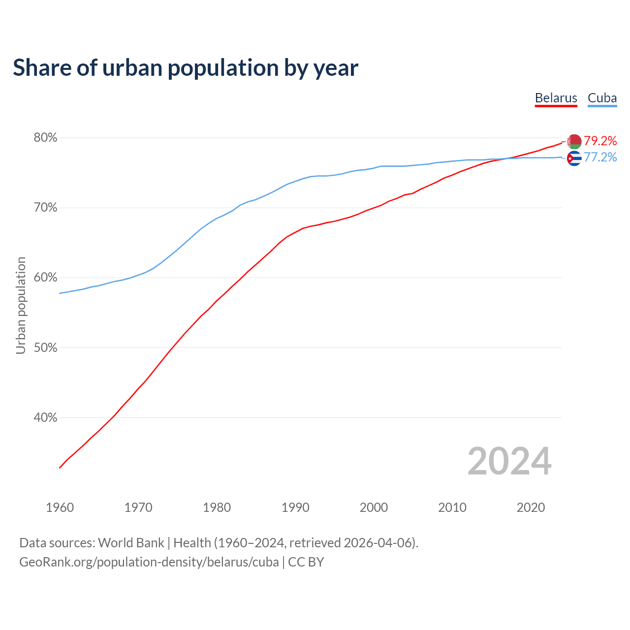 From 2004 to 2024, the share of urban population changed from 71.8% to 79.2% in Belarus and from 75.9% to 77.2% in Cuba.