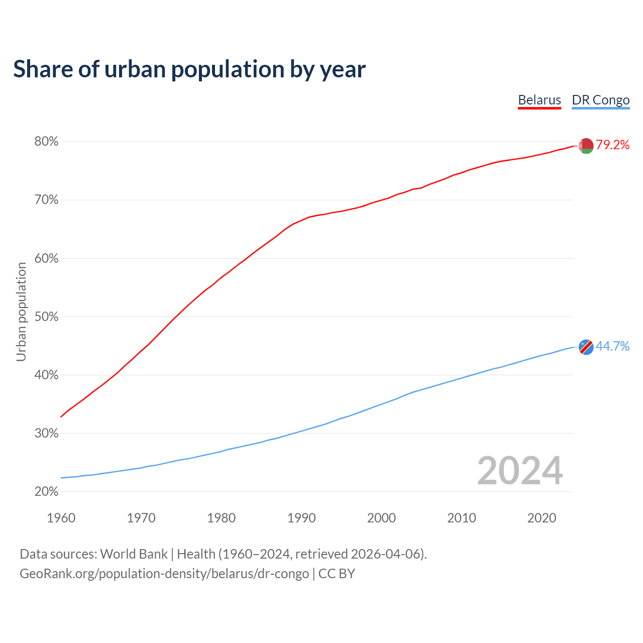 From 2004 to 2024, the share of urban population changed from 71.8% to 79.2% in Belarus and from 37% to 44.7% in the DR Congo.