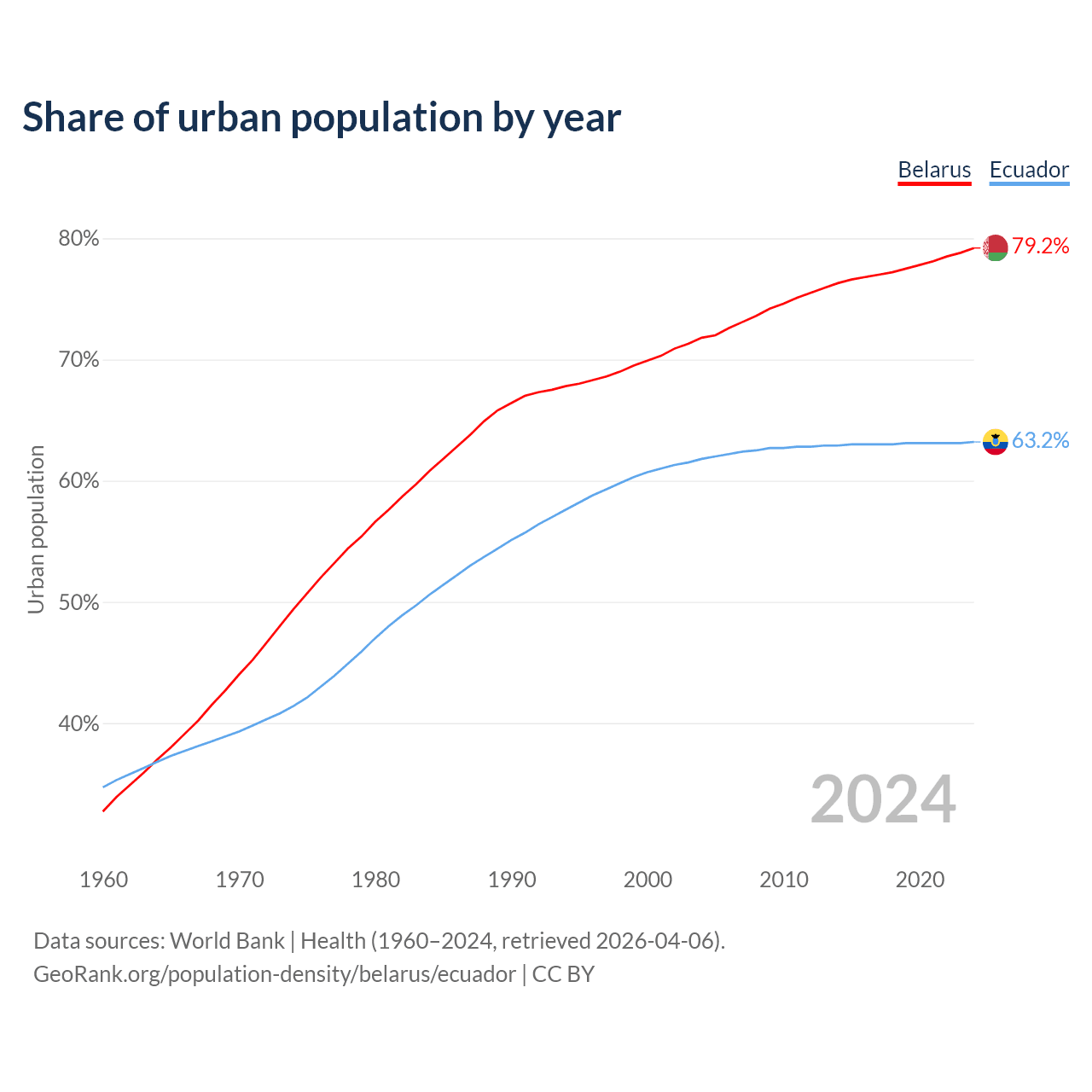 From 2004 to 2024, the share of urban population changed from 71.8% to 79.2% in Belarus and from 61.8% to 63.2% in Ecuador.