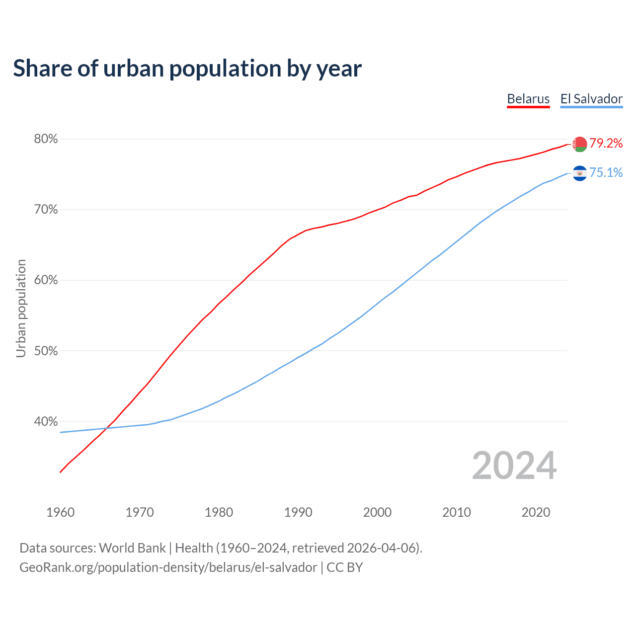 From 2004 to 2024, the share of urban population changed from 71.8% to 79.2% in Belarus and from 60.1% to 75.1% in El Salvador.
