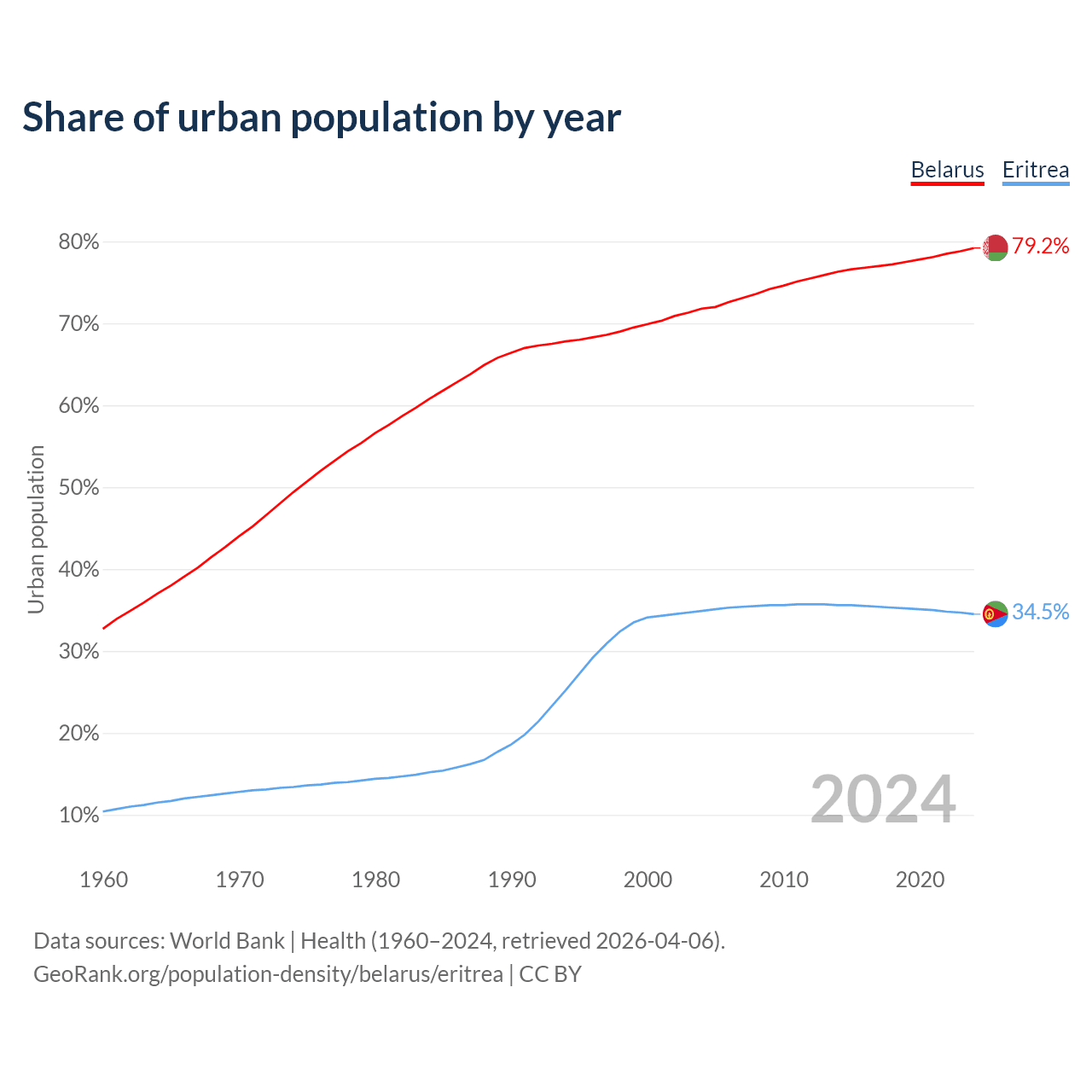From 2004 to 2024, the share of urban population changed from 71.8% to 79.2% in Belarus and from 34.9% to 34.5% in Eritrea.