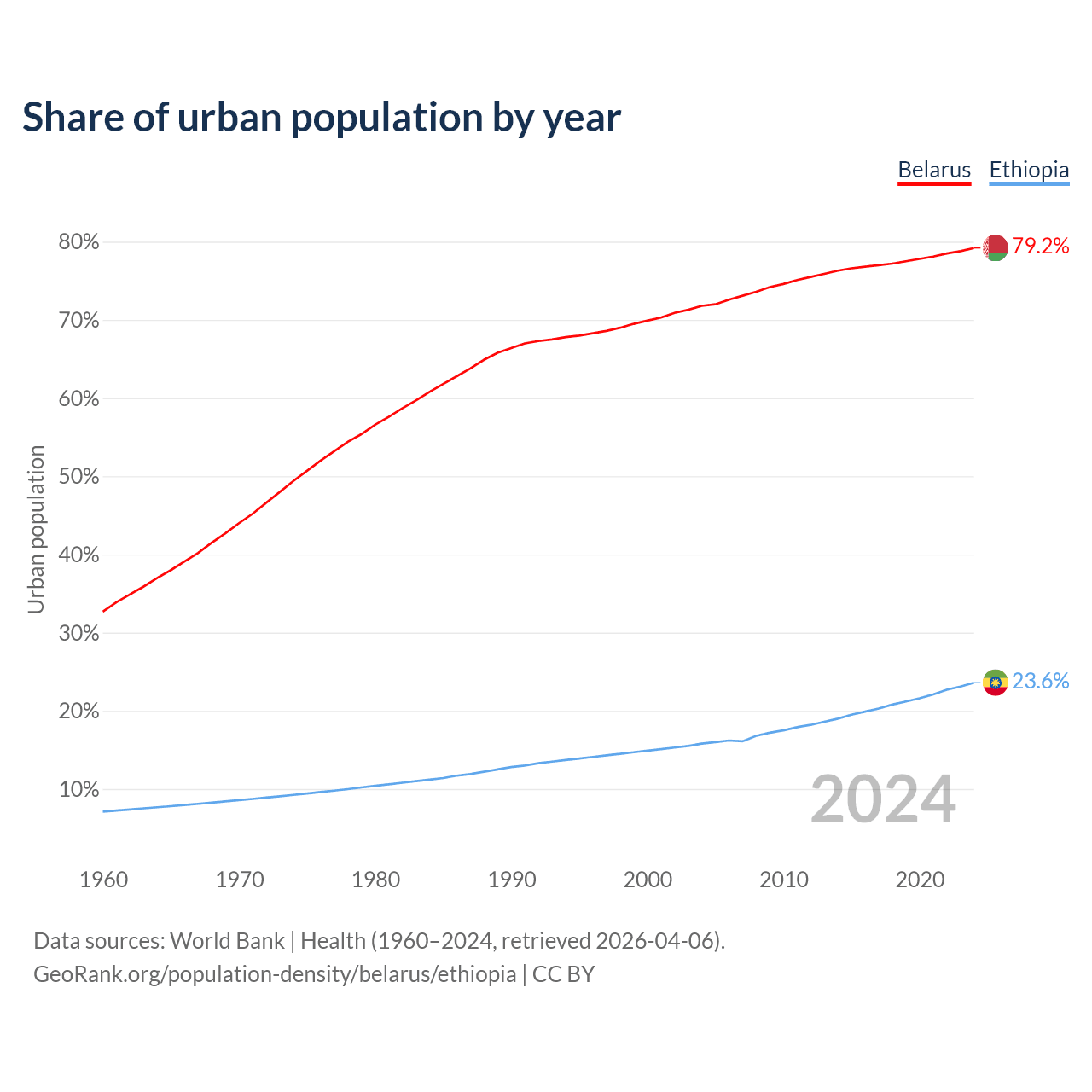 From 2004 to 2024, the share of urban population changed from 71.8% to 79.2% in Belarus and from 15.8% to 23.6% in Ethiopia.
