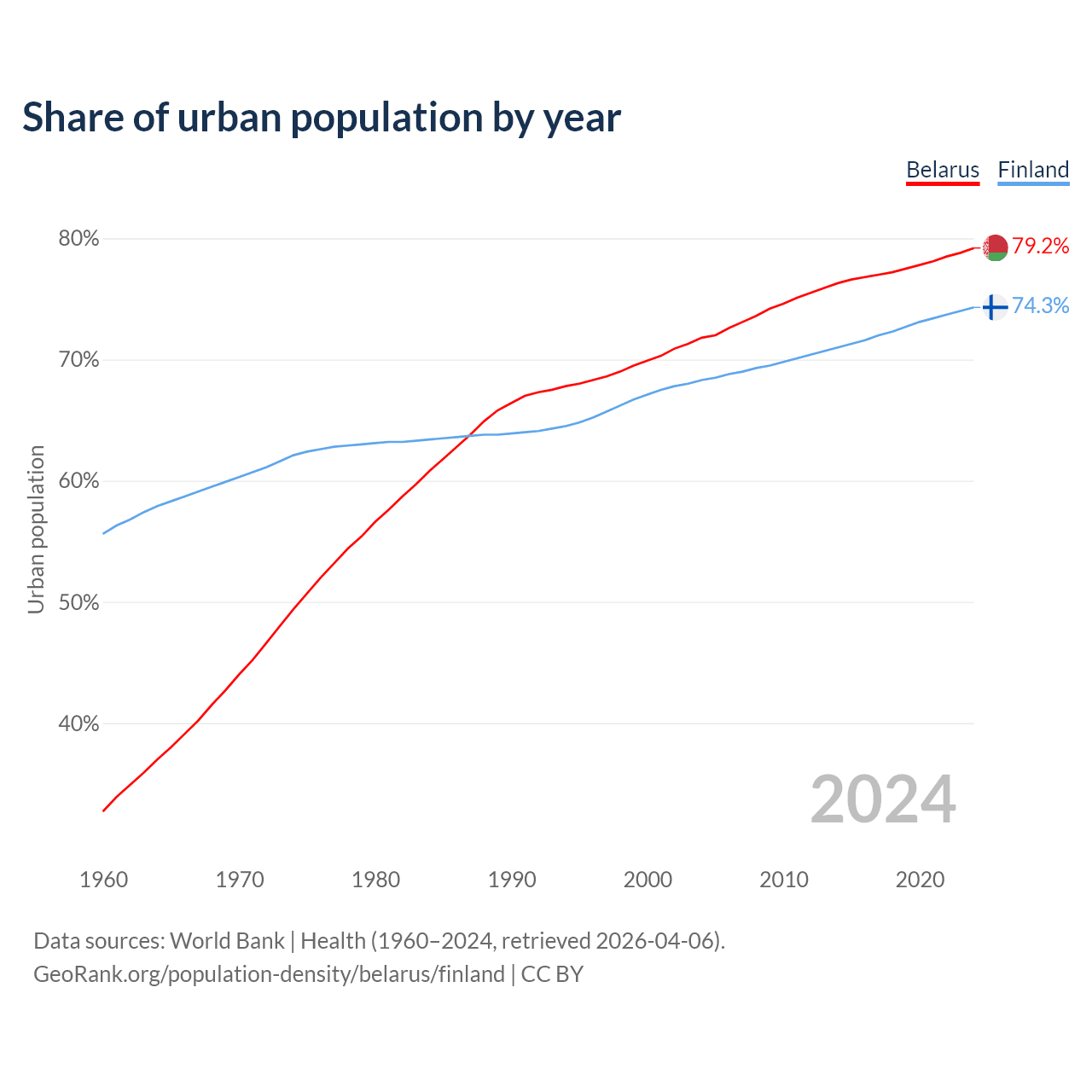 From 2004 to 2024, the share of urban population changed from 71.8% to 79.2% in Belarus and from 68.3% to 74.3% in Finland.
