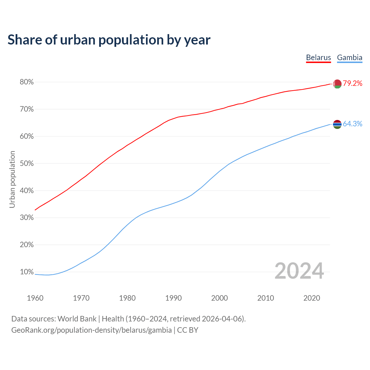 From 2004 to 2024, the share of urban population changed from 71.8% to 79.2% in Belarus and from 51.5% to 64.3% in the Gambia.