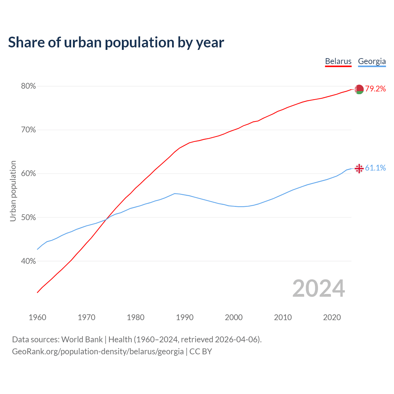 From 2004 to 2024, the share of urban population changed from 71.8% to 79.2% in Belarus and from 52.7% to 61.1% in Georgia.