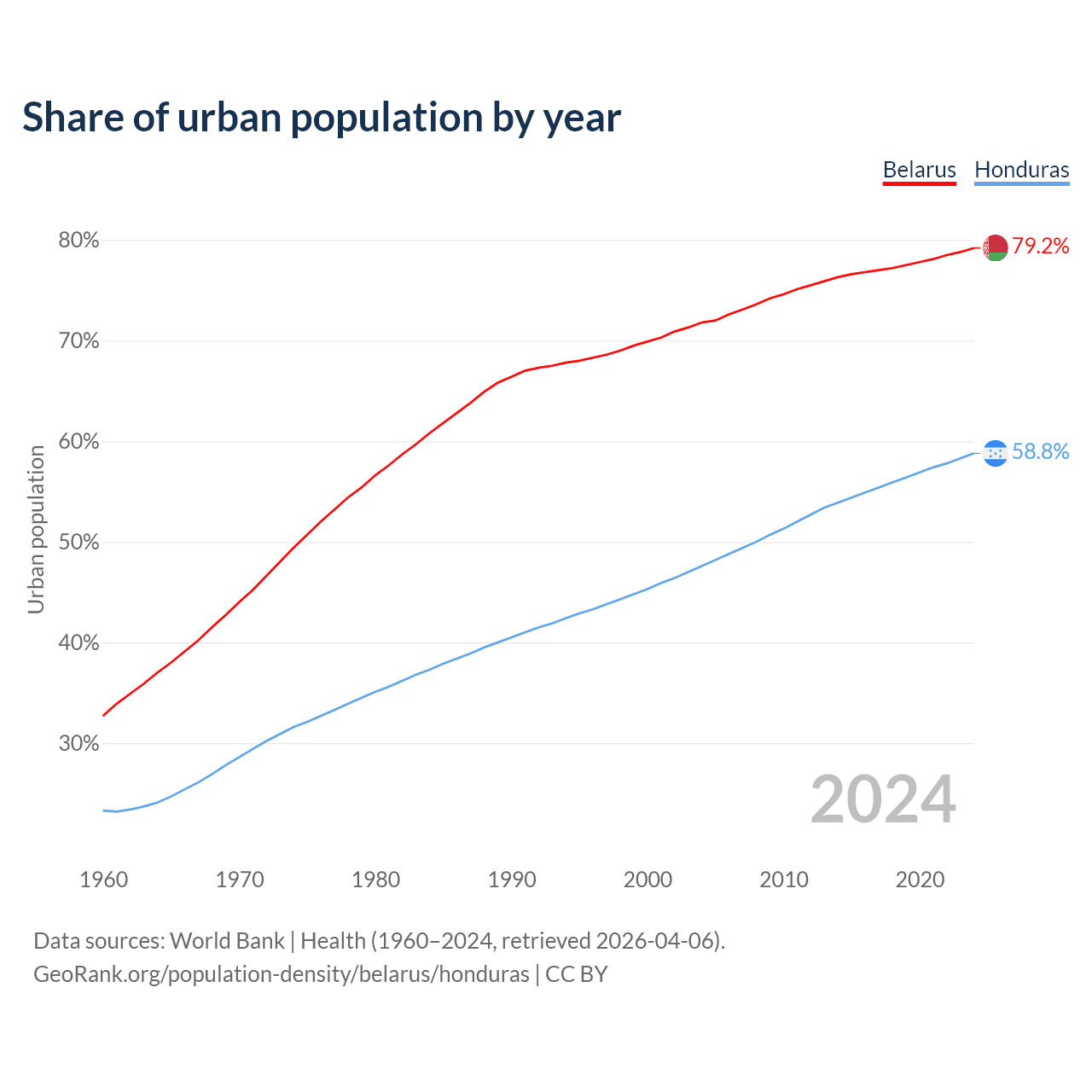 From 2004 to 2024, the share of urban population changed from 71.8% to 79.2% in Belarus and from 47.6% to 58.8% in Honduras.