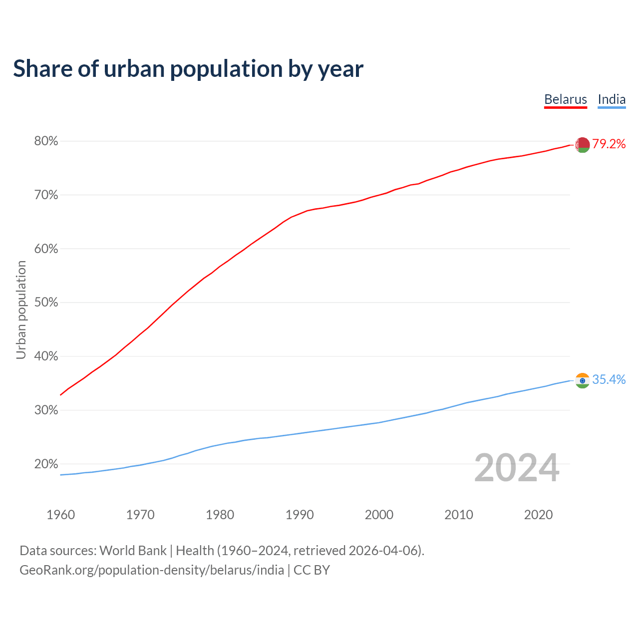 From 2004 to 2024, the share of urban population changed from 71.8% to 79.2% in Belarus and from 28.8% to 35.4% in India.