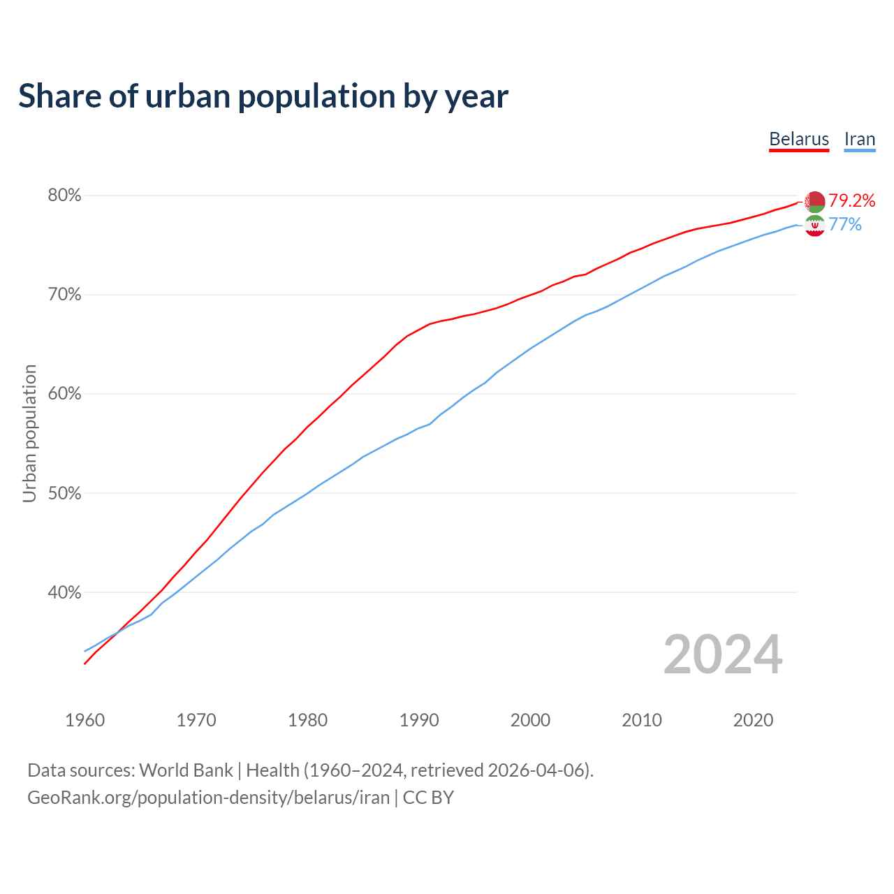 From 2004 to 2024, the share of urban population changed from 71.8% to 79.2% in Belarus and from 67.3% to 77% in Iran.