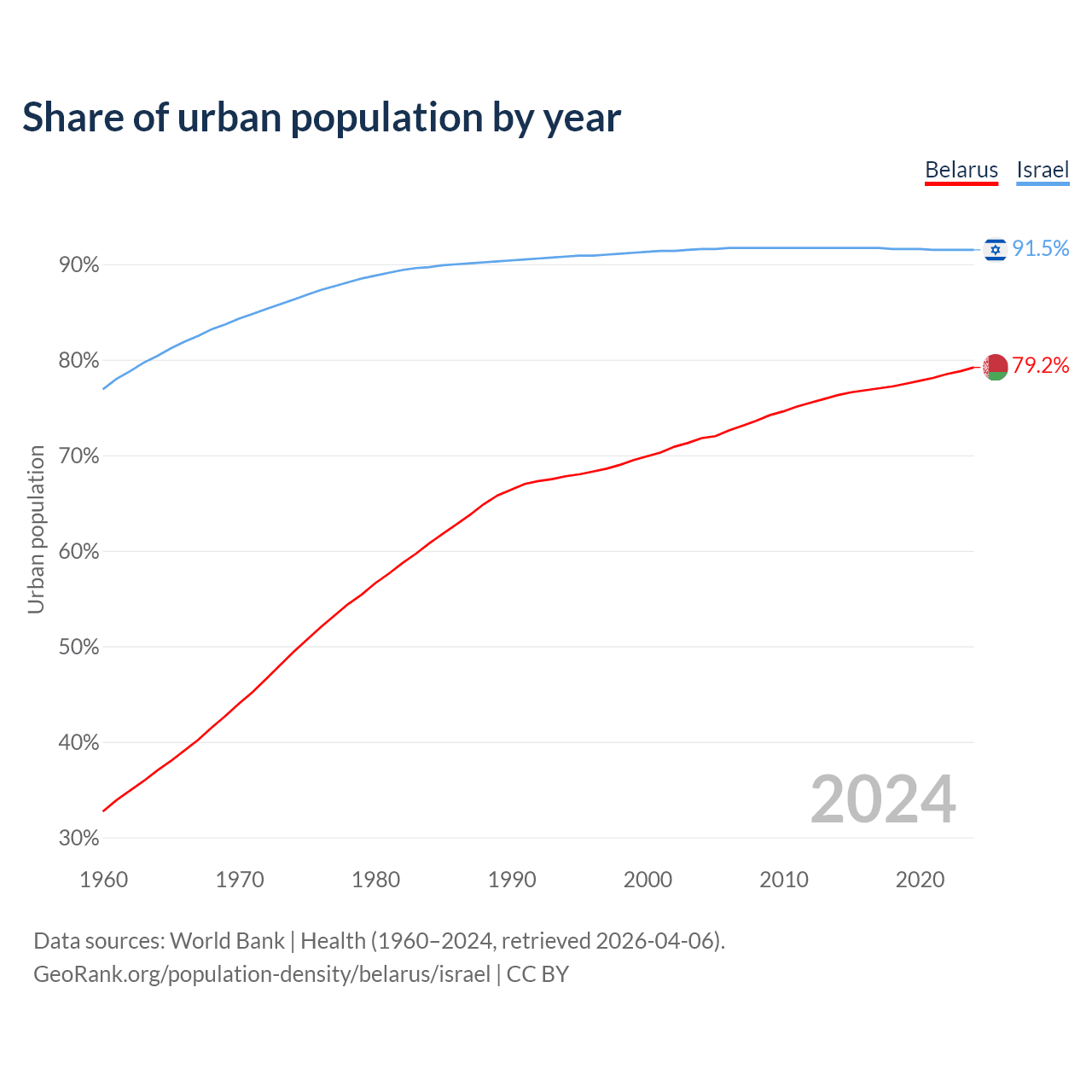 From 2004 to 2024, the share of urban population changed from 71.8% to 79.2% in Belarus and from 91.6% to 91.5% in Israel.