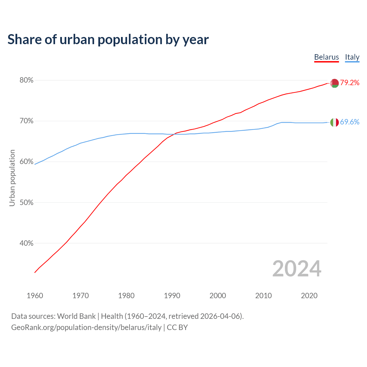 From 2004 to 2024, the share of urban population changed from 71.8% to 79.2% in Belarus and from 67.5% to 69.6% in Italy.