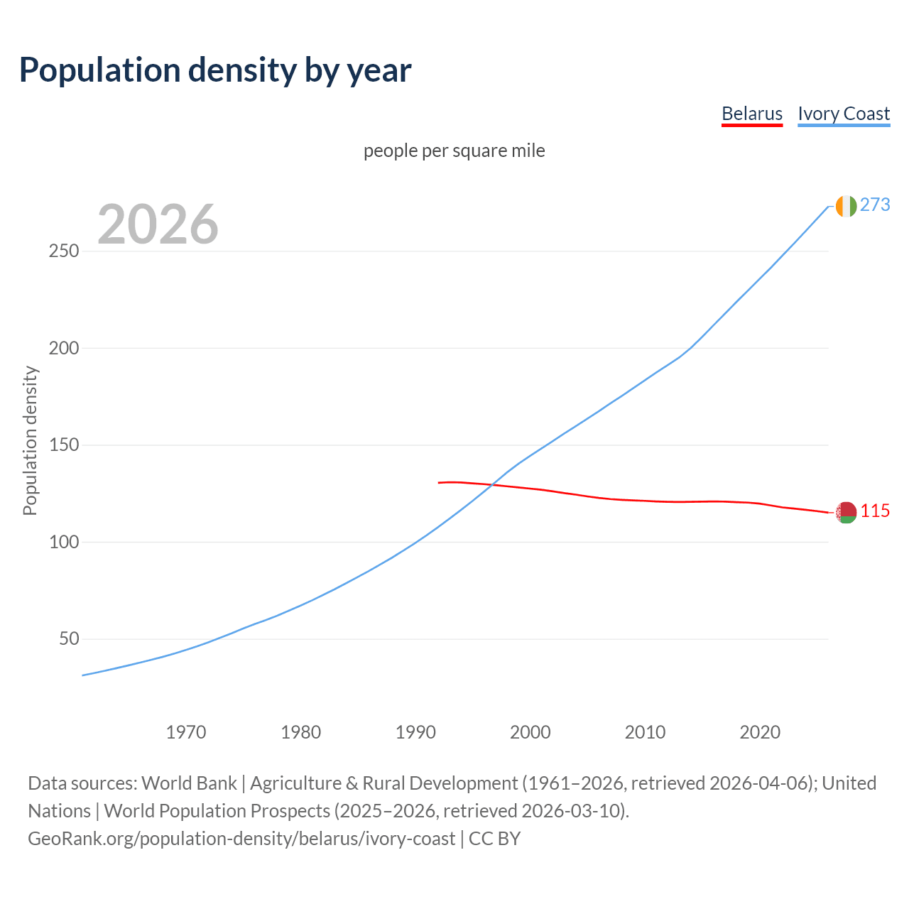 From 2006 to 2026, population density in Belarus decreased by 6.19%, compared to a 63.1% growth in Ivory Coast.