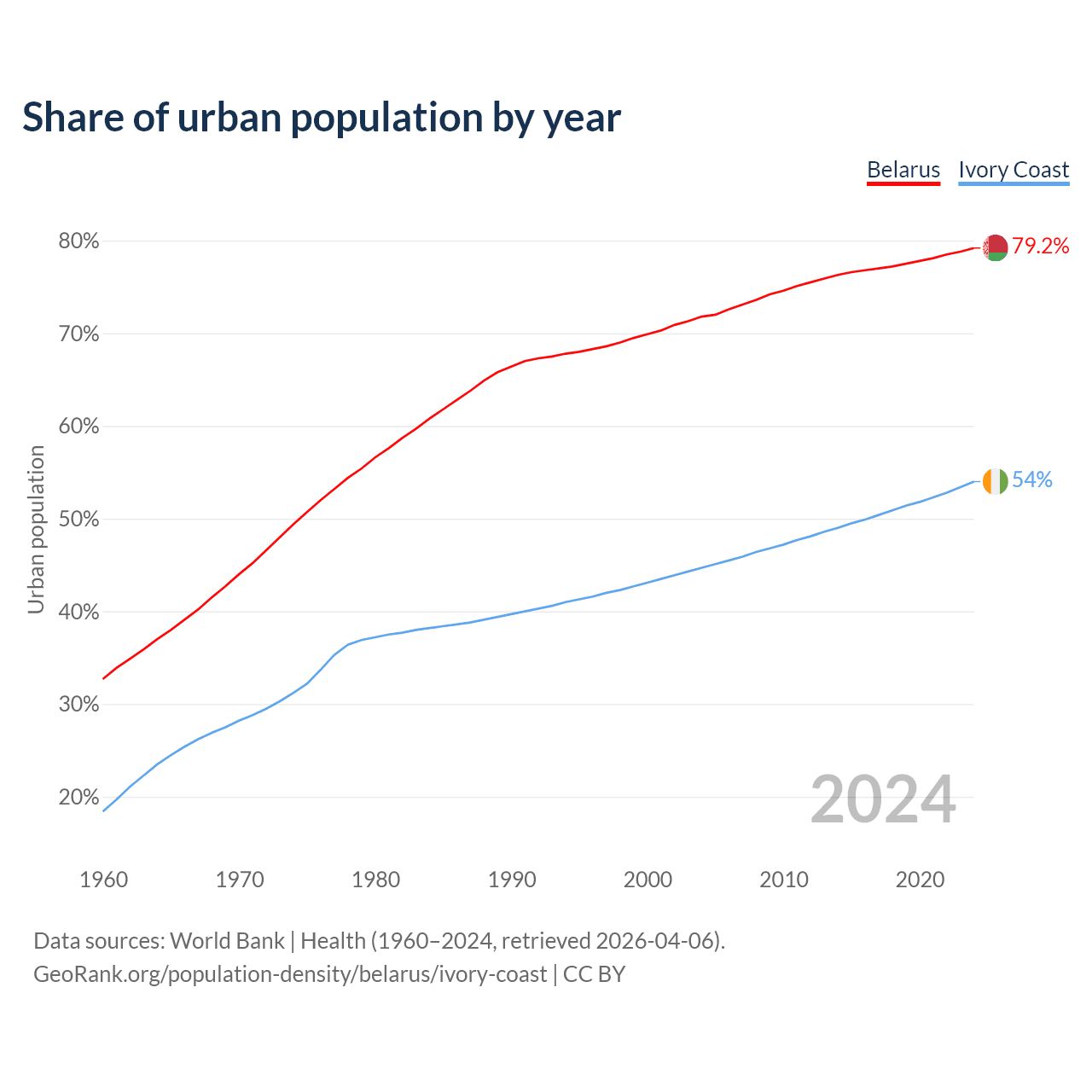 From 2004 to 2024, the share of urban population changed from 71.8% to 79.2% in Belarus and from 44.7% to 54% in Ivory Coast.