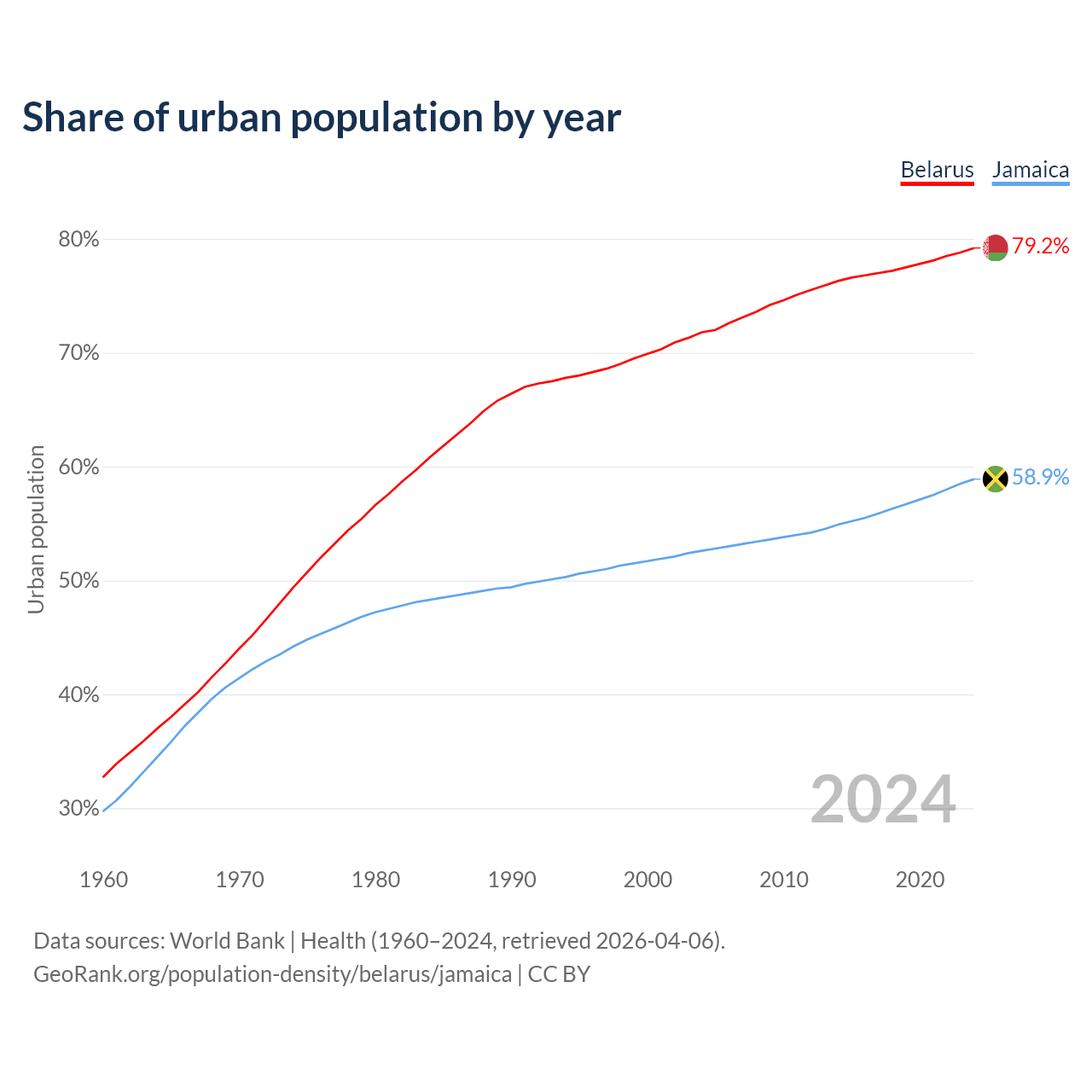 From 2004 to 2024, the share of urban population changed from 71.8% to 79.2% in Belarus and from 52.6% to 58.9% in Jamaica.