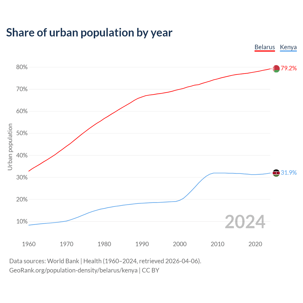 From 2004 to 2024, the share of urban population changed from 71.8% to 79.2% in Belarus and from 25.4% to 31.9% in Kenya.