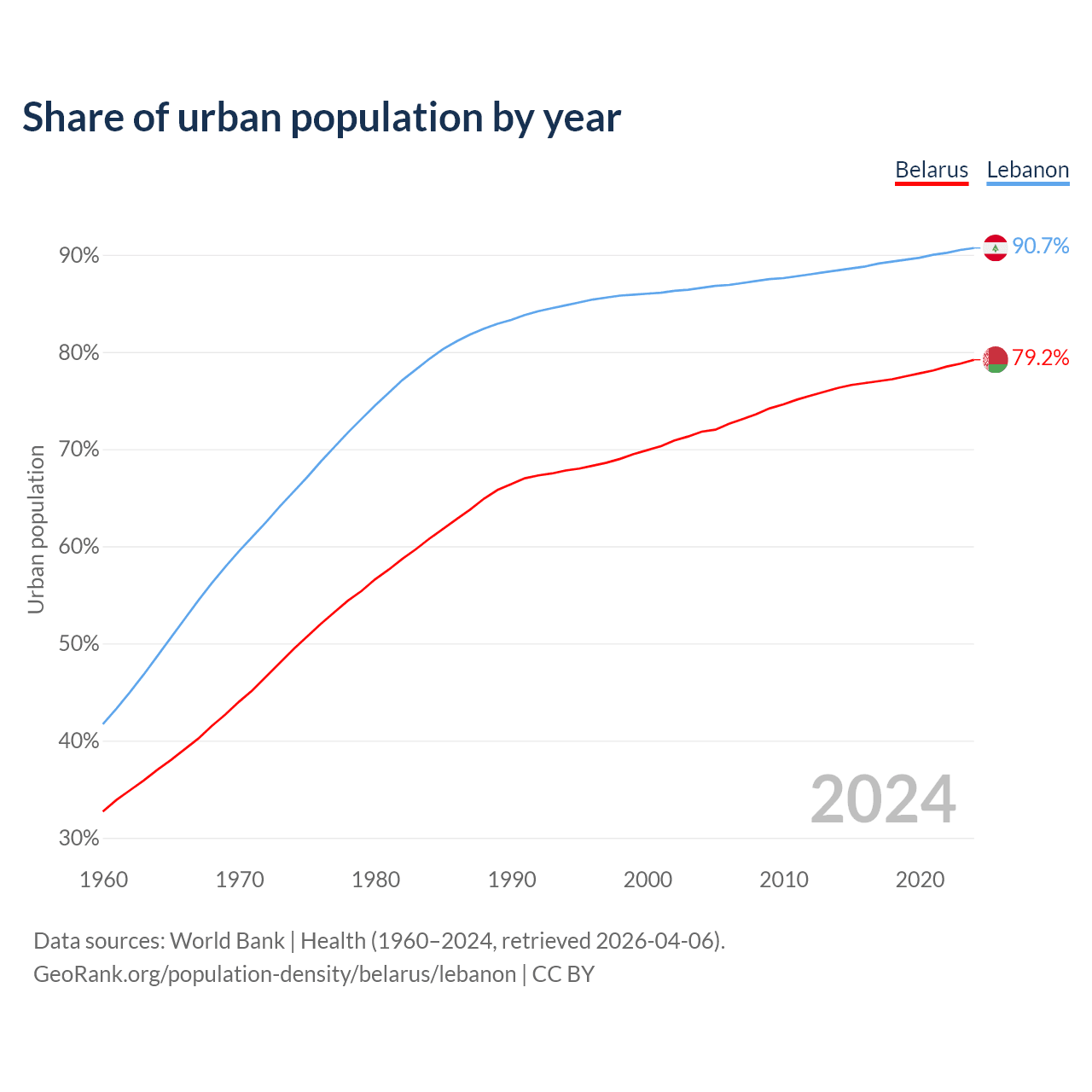 From 2006 to 2026, population density in Belarus decreased by 6.19%, compared to a 24% growth in Lebanon.