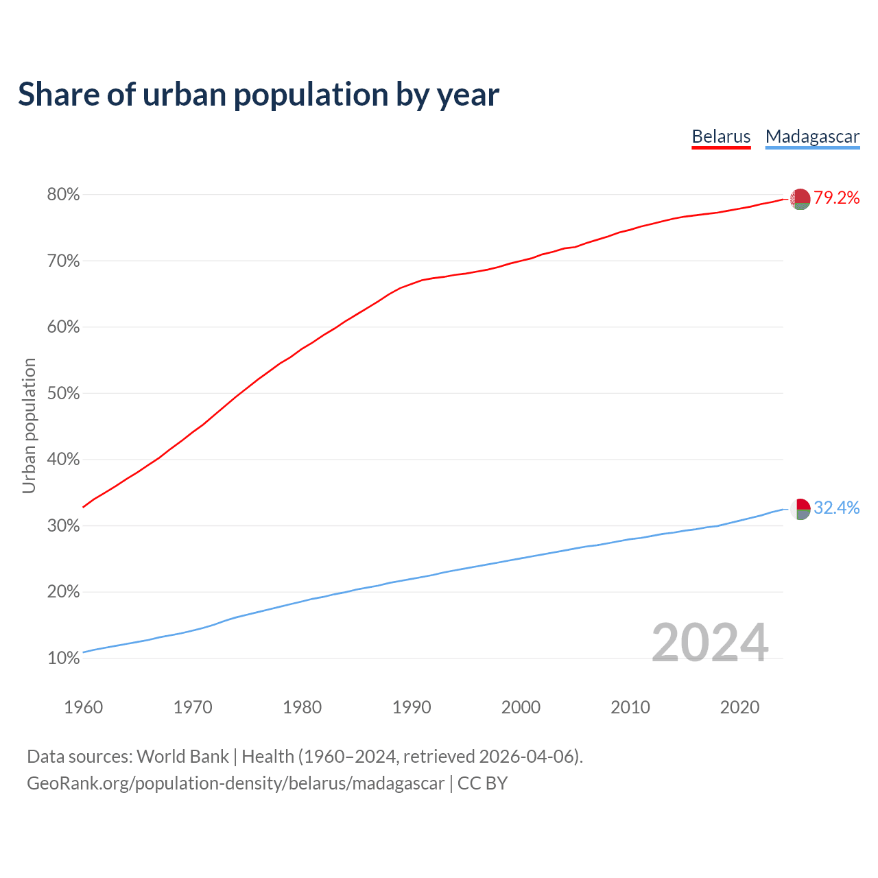 From 2004 to 2024, the share of urban population changed from 71.8% to 79.2% in Belarus and from 26.2% to 32.4% in Madagascar.