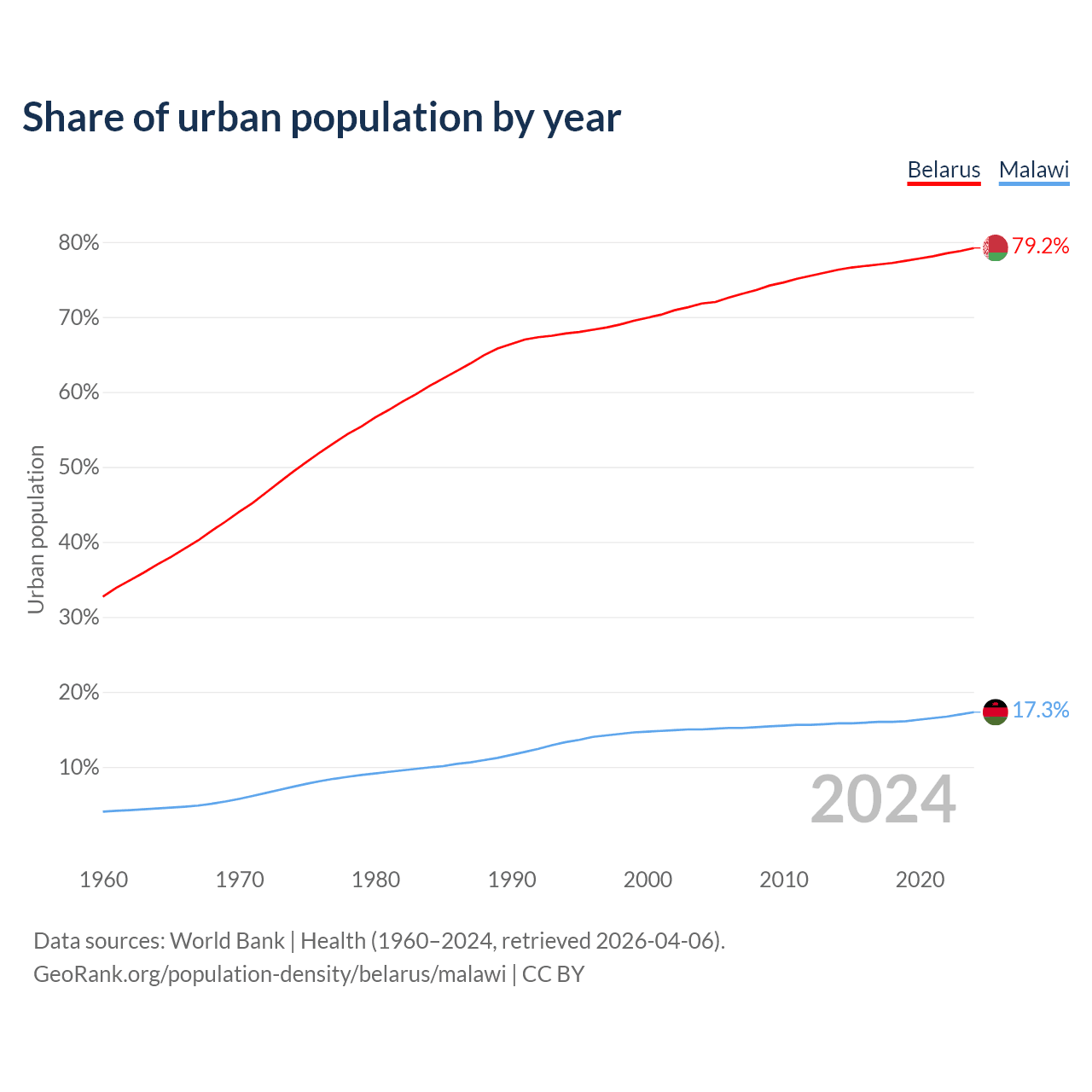 From 2004 to 2024, the share of urban population changed from 71.8% to 79.2% in Belarus and from 15% to 17.3% in Malawi.