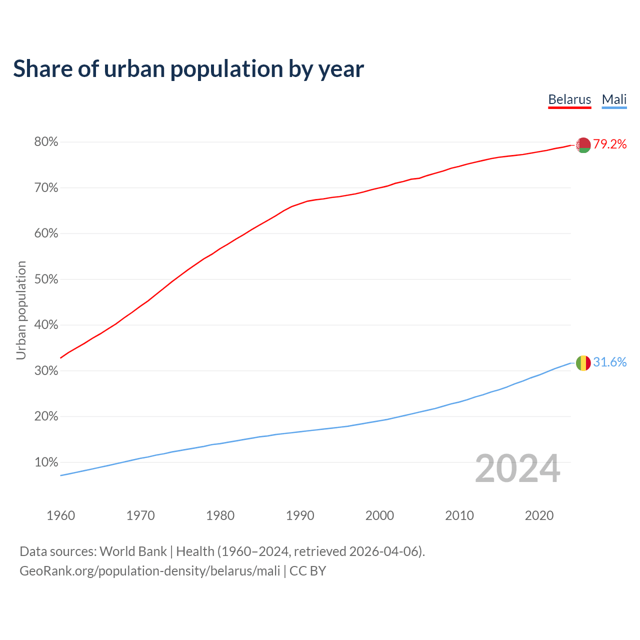 From 2004 to 2024, the share of urban population changed from 71.8% to 79.2% in Belarus and from 20.5% to 31.6% in Mali.