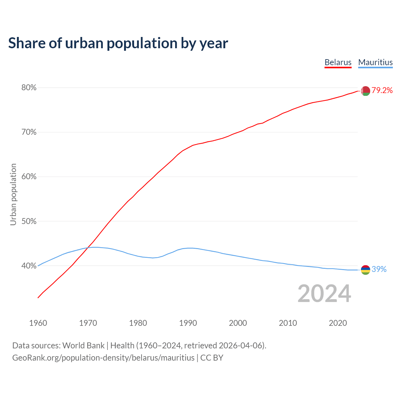 From 2004 to 2024, the share of urban population changed from 71.8% to 79.2% in Belarus and from 41.3% to 39% in Mauritius.