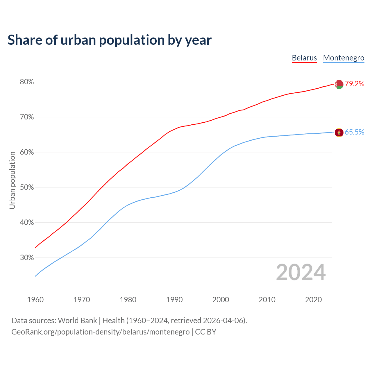 From 2004 to 2024, the share of urban population changed from 71.8% to 79.2% in Belarus and from 62.2% to 65.5% in Montenegro.