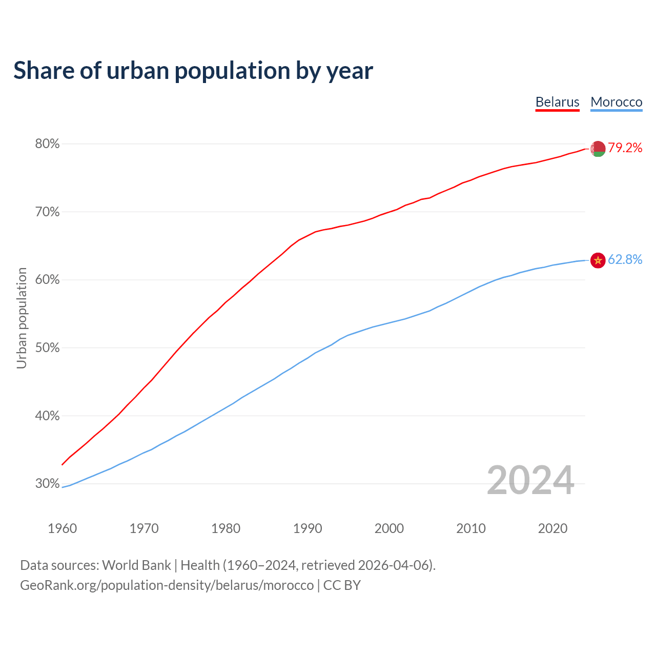 From 2004 to 2024, the share of urban population changed from 71.8% to 79.2% in Belarus and from 55% to 62.8% in Morocco.