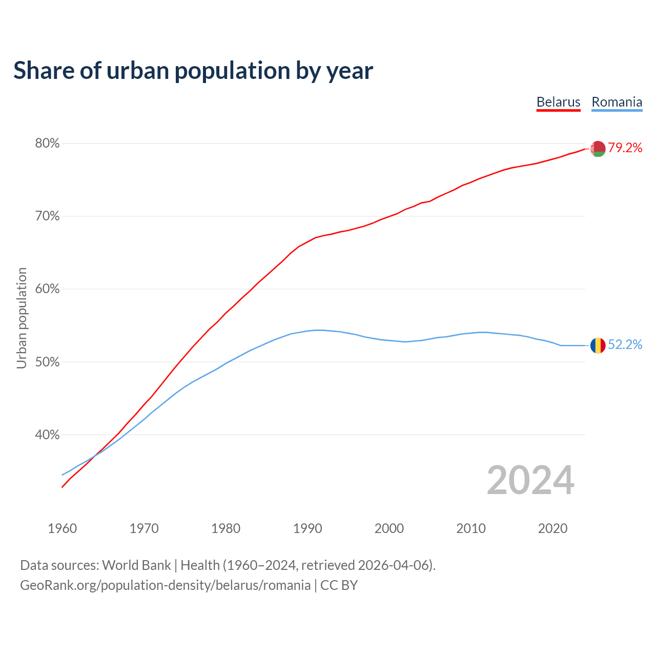 From 2004 to 2024, the share of urban population changed from 71.8% to 79.2% in Belarus and from 52.9% to 52.2% in Romania.