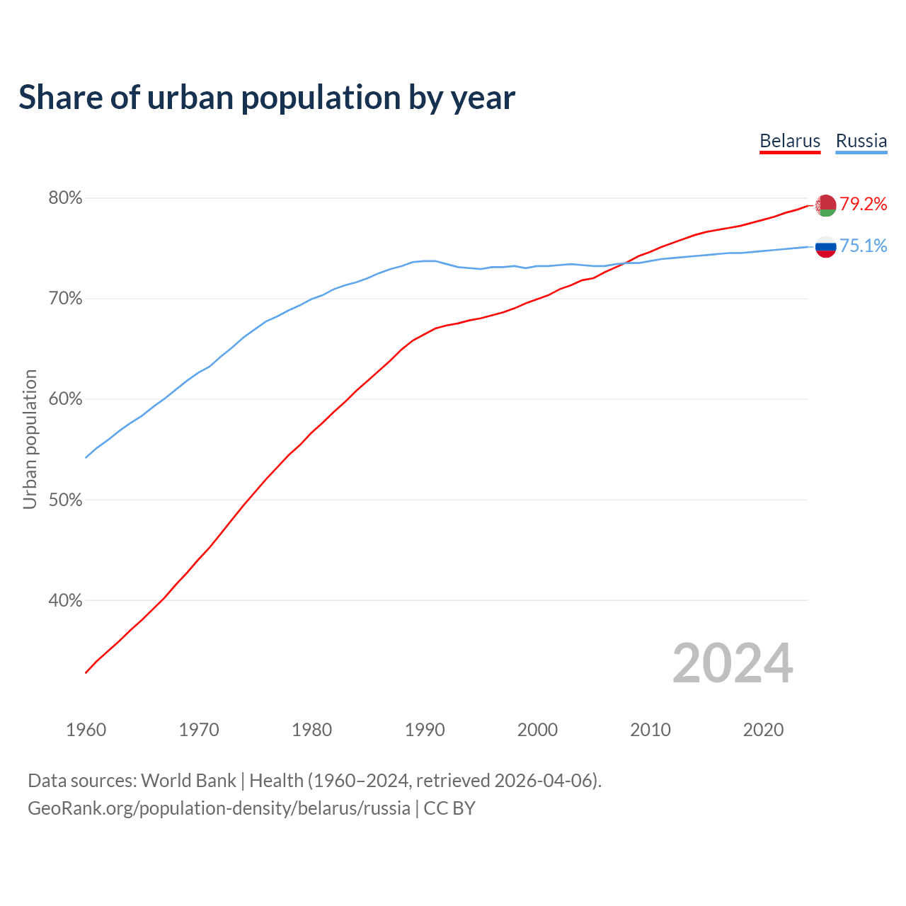 From 2004 to 2024, the share of urban population changed from 71.8% to 79.2% in Belarus and from 73.3% to 75.1% in Russia.