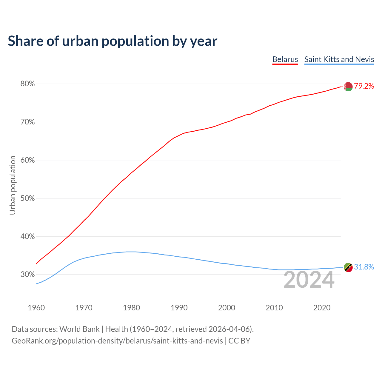 From 2004 to 2024, the share of urban population changed from 71.8% to 79.2% in Belarus and from 32.1% to 31.8% in Saint Kitts and Nevis.