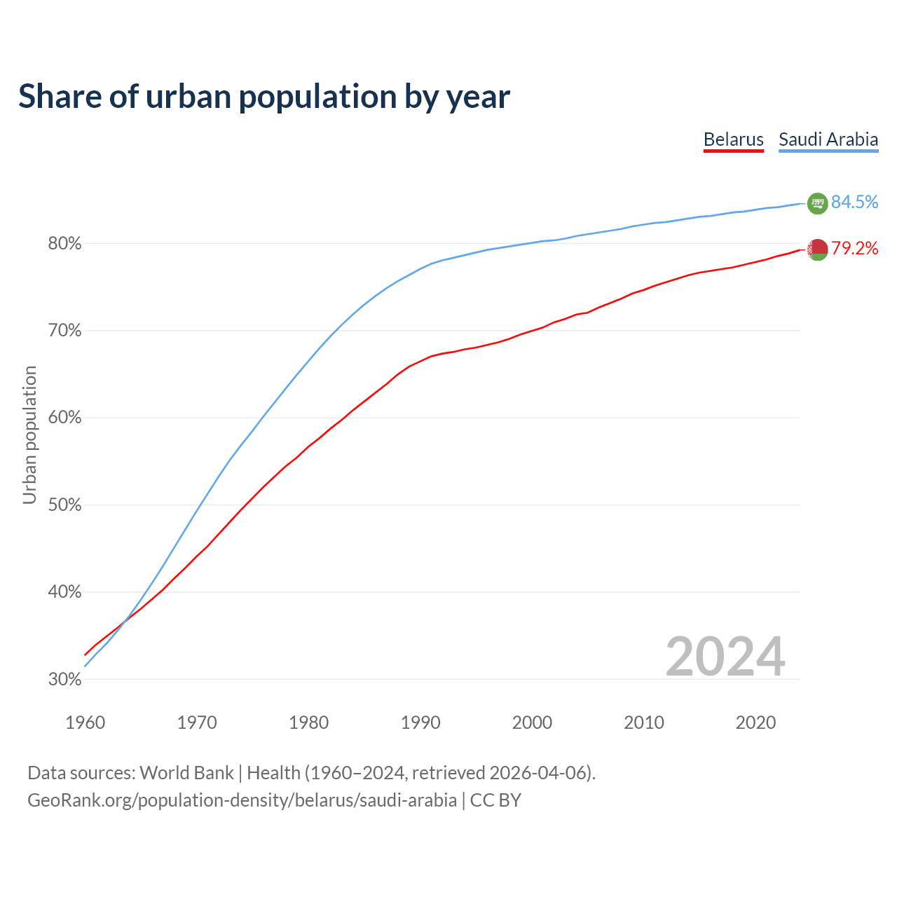 From 2004 to 2024, the share of urban population changed from 71.8% to 79.2% in Belarus and from 80.8% to 84.5% in Saudi Arabia.