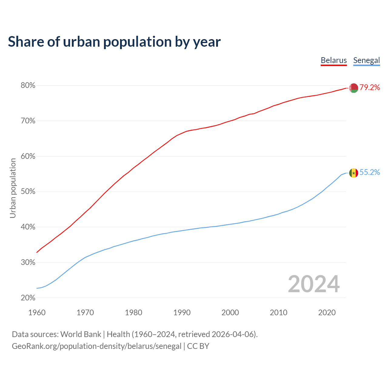 From 2004 to 2024, the share of urban population changed from 71.8% to 79.2% in Belarus and from 41.6% to 55.2% in Senegal.