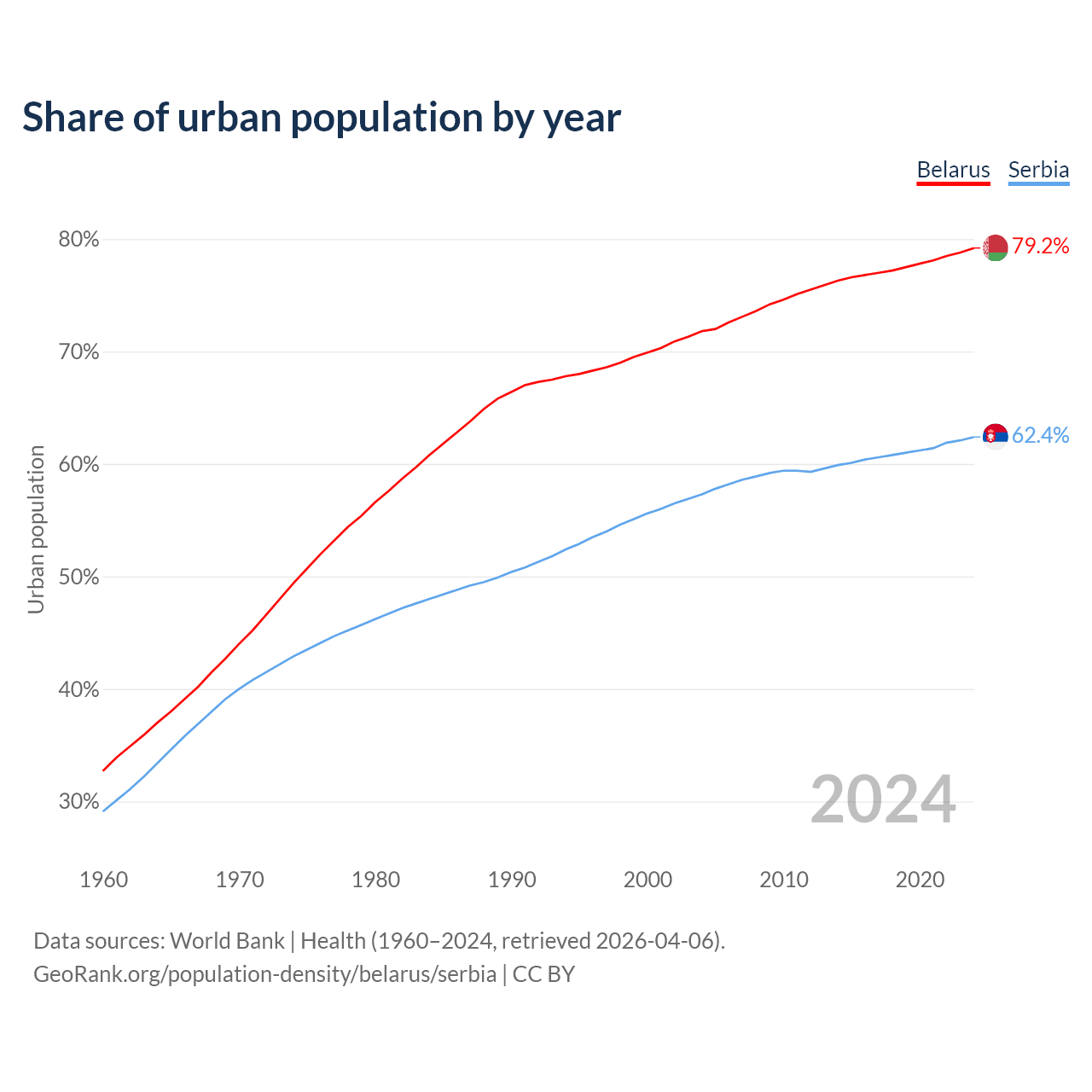 From 2004 to 2024, the share of urban population changed from 71.8% to 79.2% in Belarus and from 57.3% to 62.4% in Serbia.