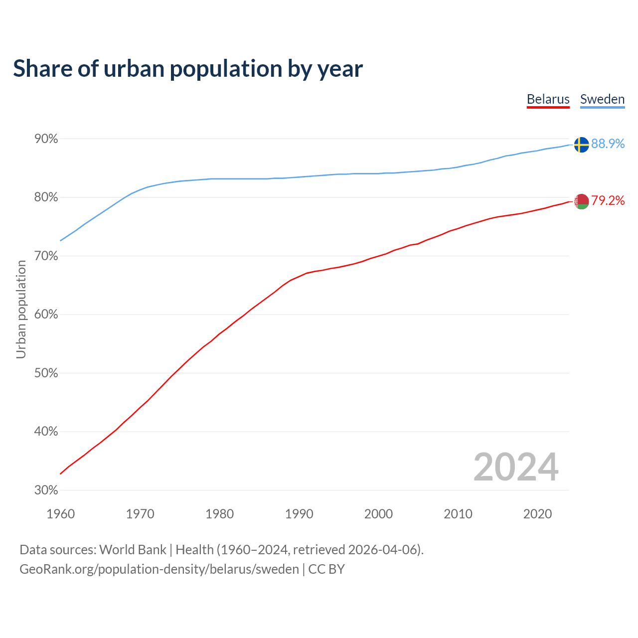 From 2004 to 2024, the share of urban population changed from 71.8% to 79.2% in Belarus and from 84.3% to 88.9% in Sweden.