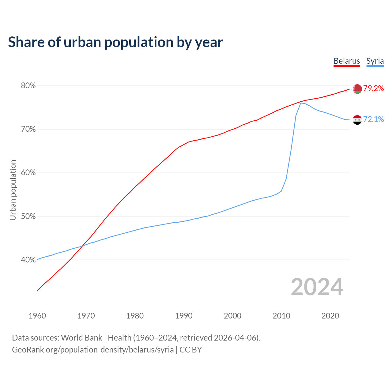 From 2004 to 2024, the share of urban population changed from 71.8% to 79.2% in Belarus and from 53.5% to 72.1% in Syria.