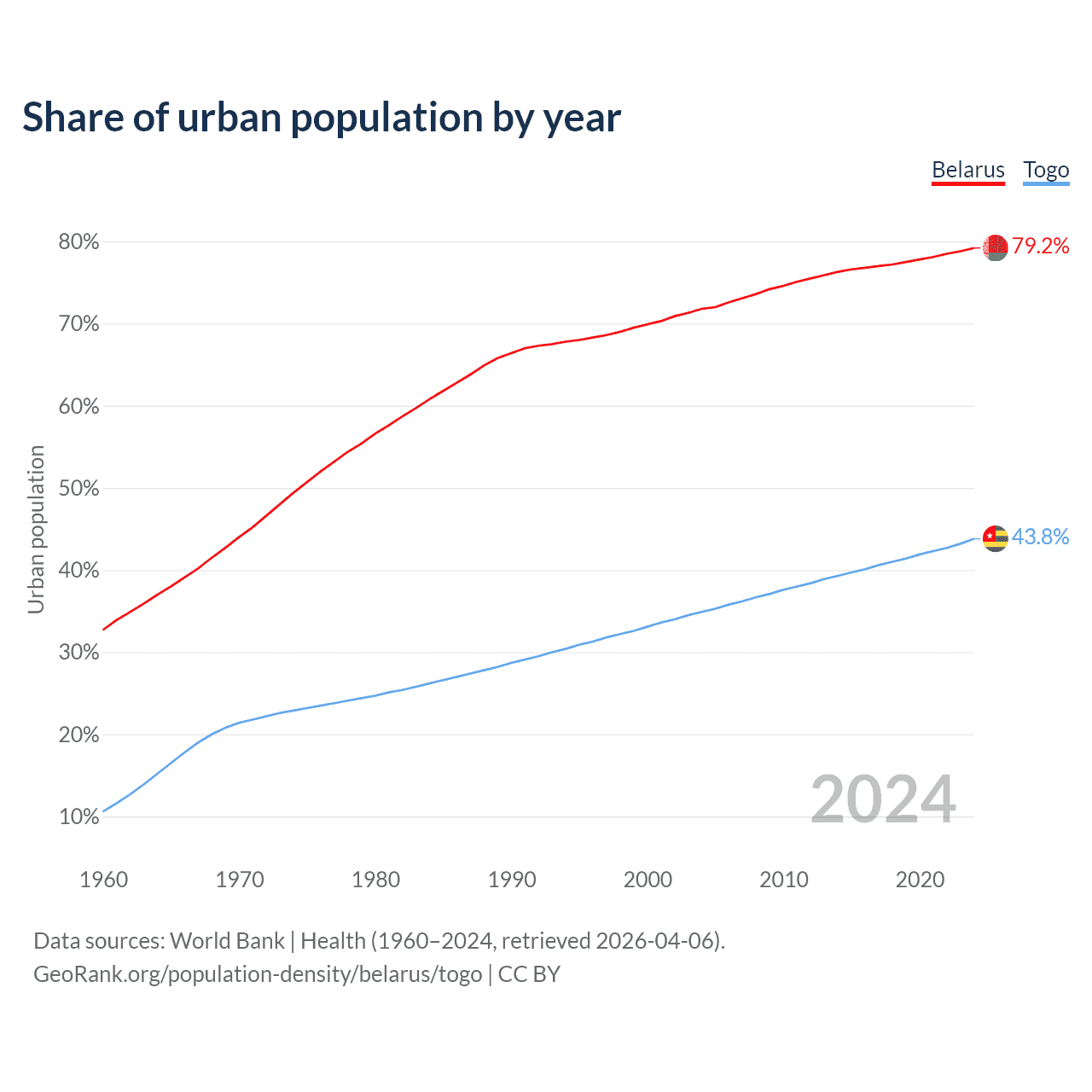 From 2004 to 2024, the share of urban population changed from 71.8% to 79.2% in Belarus and from 34.9% to 43.8% in Togo.