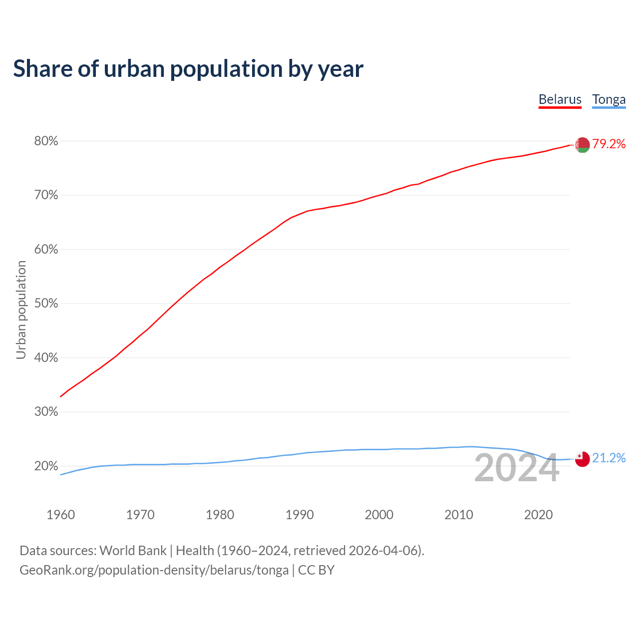 From 2004 to 2024, the share of urban population changed from 71.8% to 79.2% in Belarus and from 23.1% to 21.2% in Tonga.