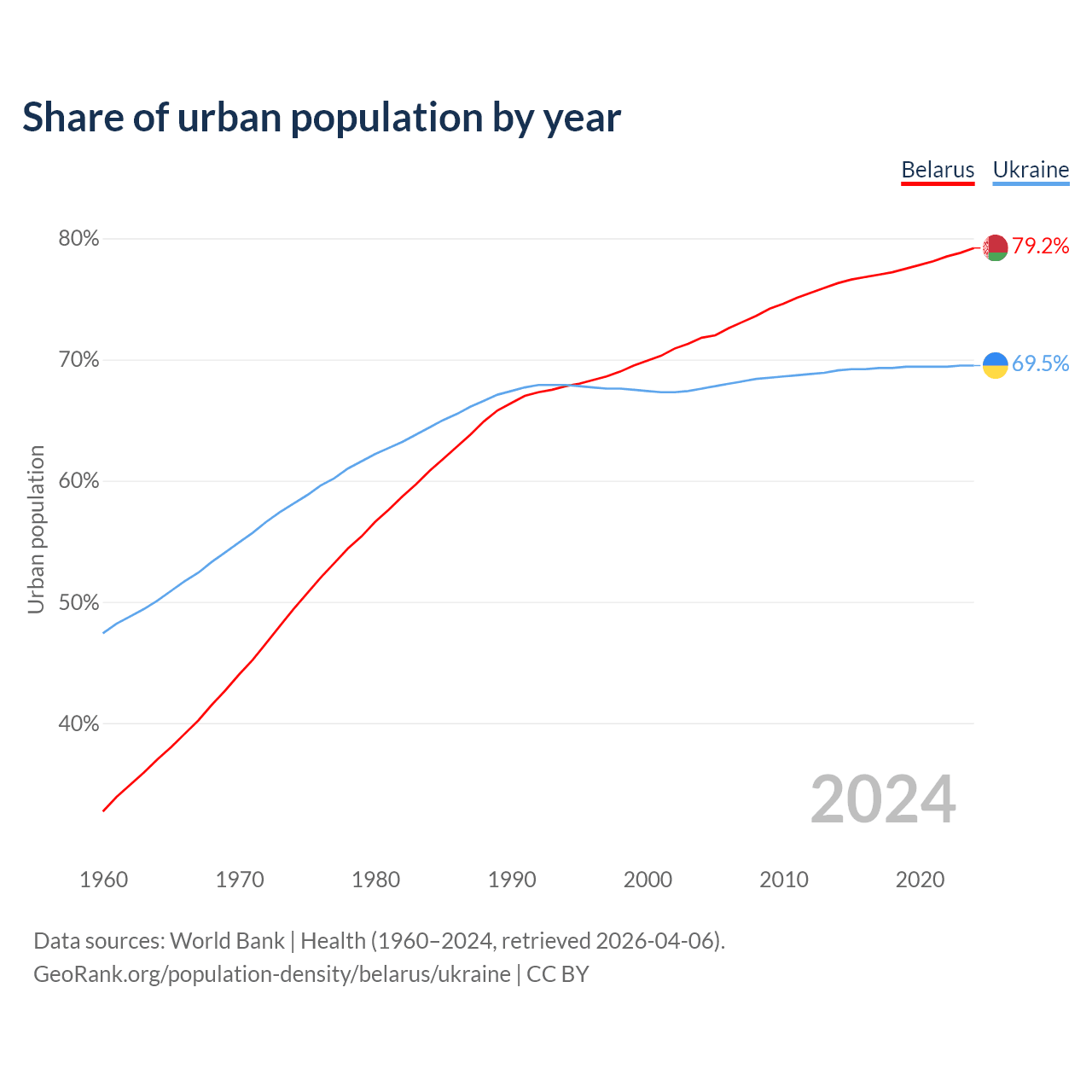 From 2004 to 2024, the share of urban population changed from 71.8% to 79.2% in Belarus and from 67.6% to 69.5% in Ukraine.