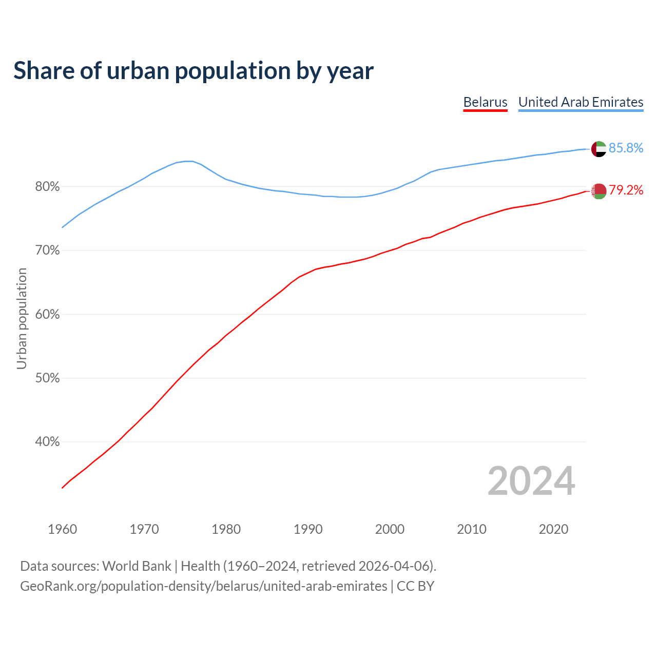 From 2004 to 2024, the share of urban population changed from 71.8% to 79.2% in Belarus and from 81.5% to 85.8% in the United Arab Emirates.