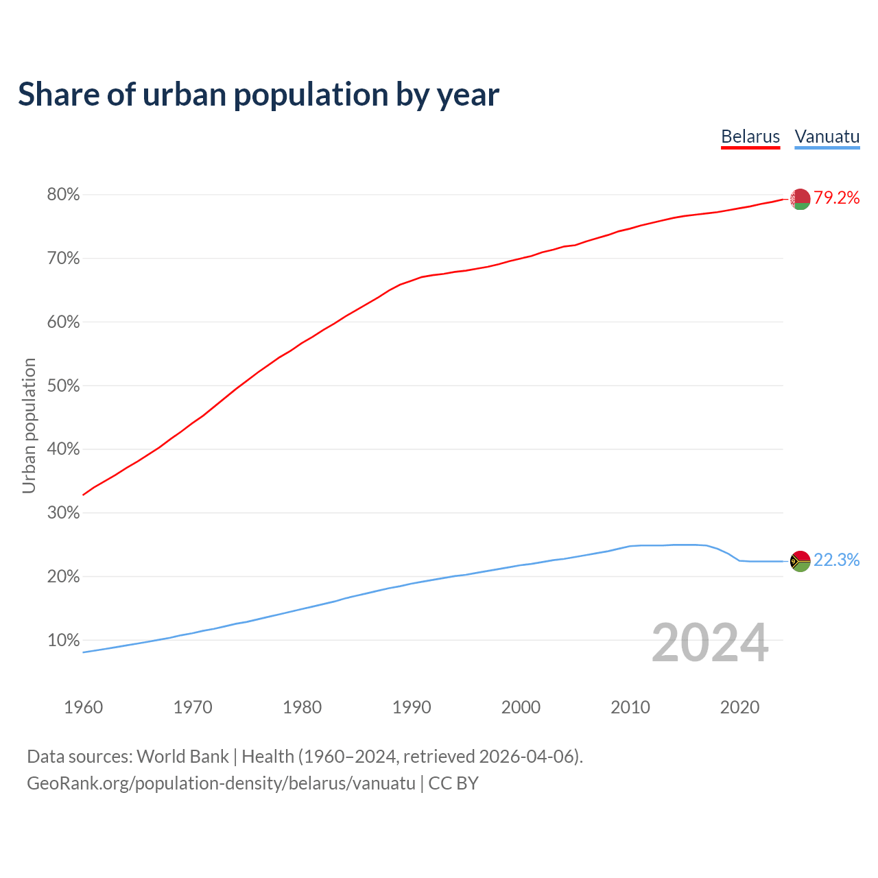 From 2004 to 2024, the share of urban population changed from 71.8% to 79.2% in Belarus and from 22.7% to 22.3% in Vanuatu.