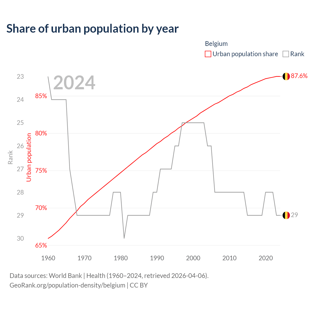 This chart shows the share of urban population in Belgium from 1960 to 2024: 65.9% lived in urban areas in 1960, 82% in 2000, and 87.6% in 2024.