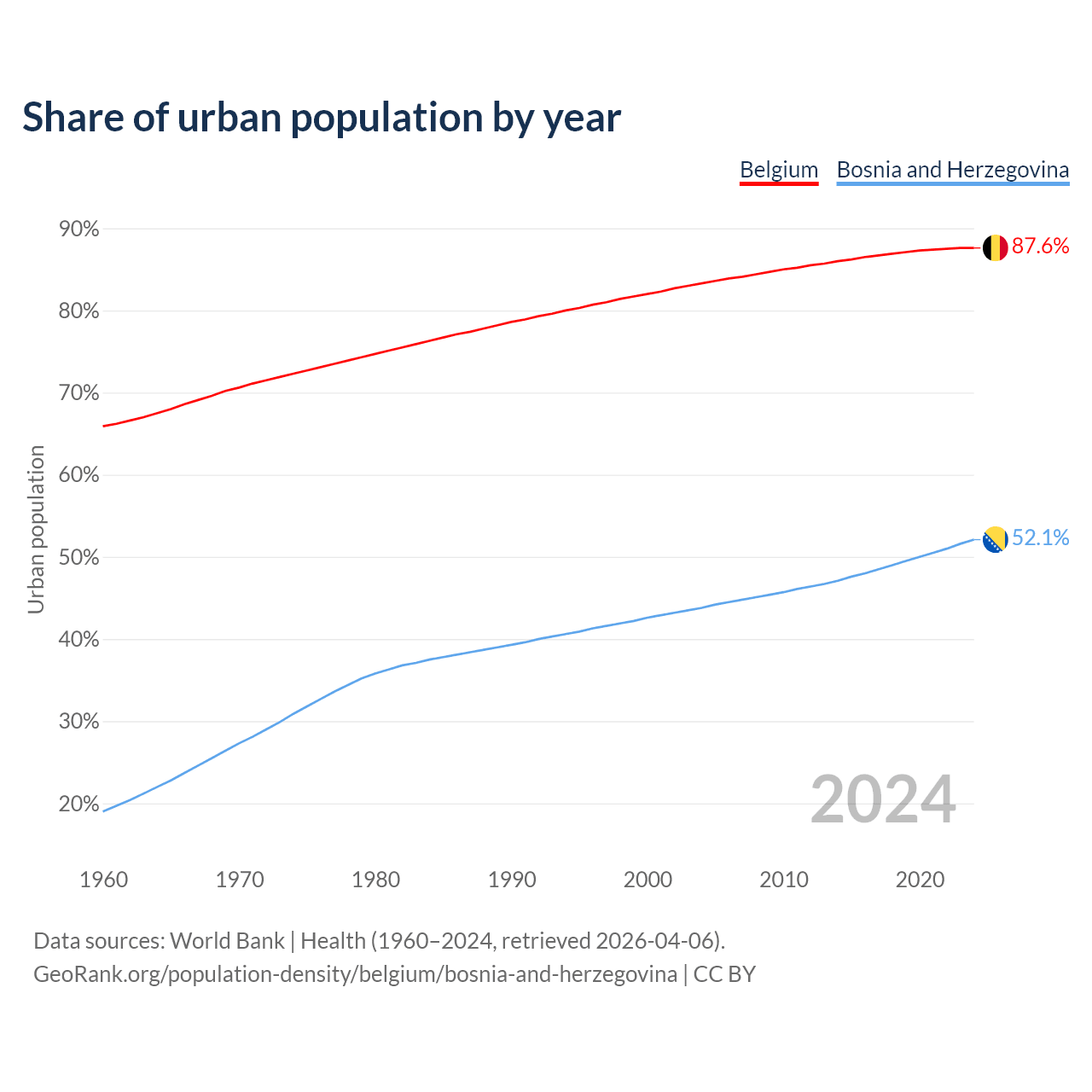 From 2004 to 2024, the share of urban population changed from 83.3% to 87.6% in Belgium and from 43.8% to 52.1% in Bosnia and Herzegovina.