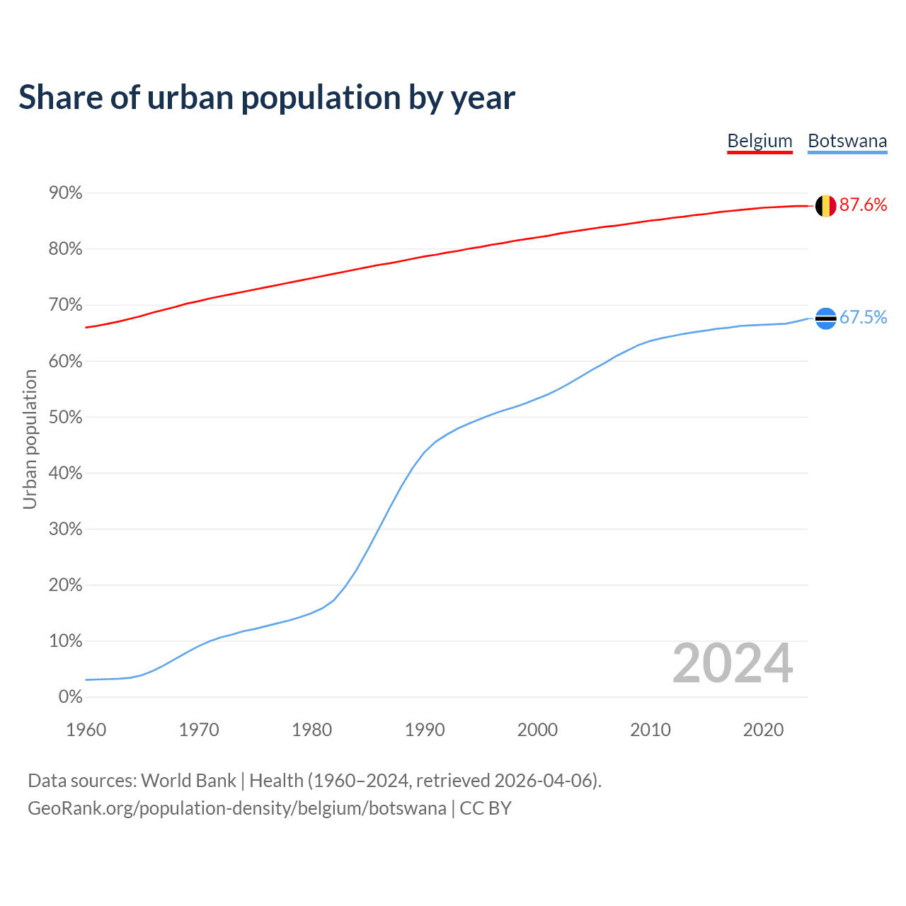 From 2004 to 2024, the share of urban population changed from 83.3% to 87.6% in Belgium and from 57.3% to 67.5% in Botswana.