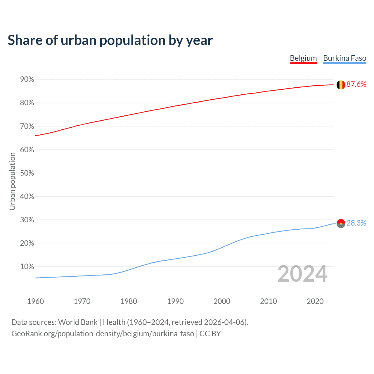 From 2004 to 2024, the share of urban population changed from 83.3% to 87.6% in Belgium and from 21.3% to 28.3% in Burkina Faso.