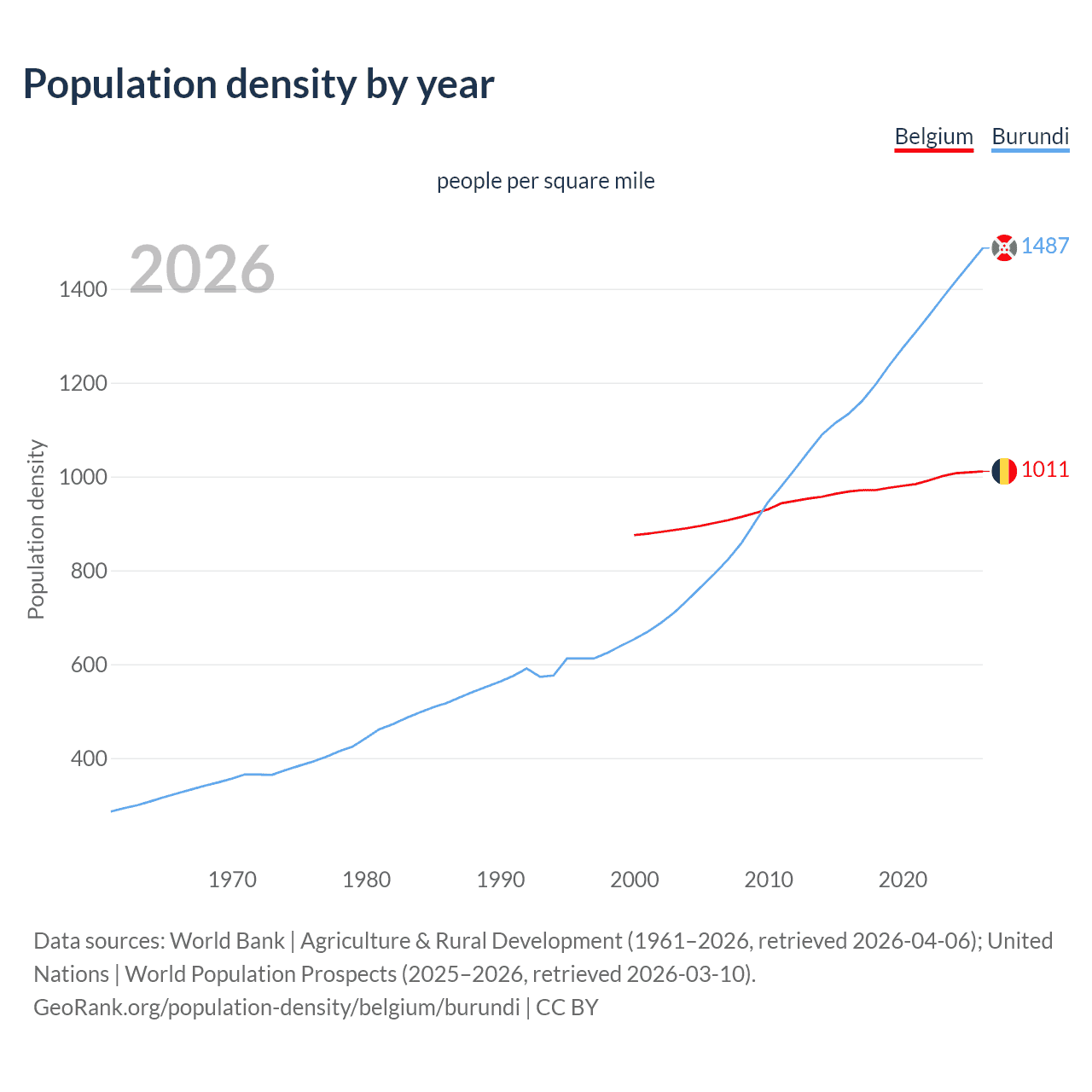 From 2006 to 2026, population density in Belgium increased by 12.2%, compared to a 87.4% growth in Burundi.
