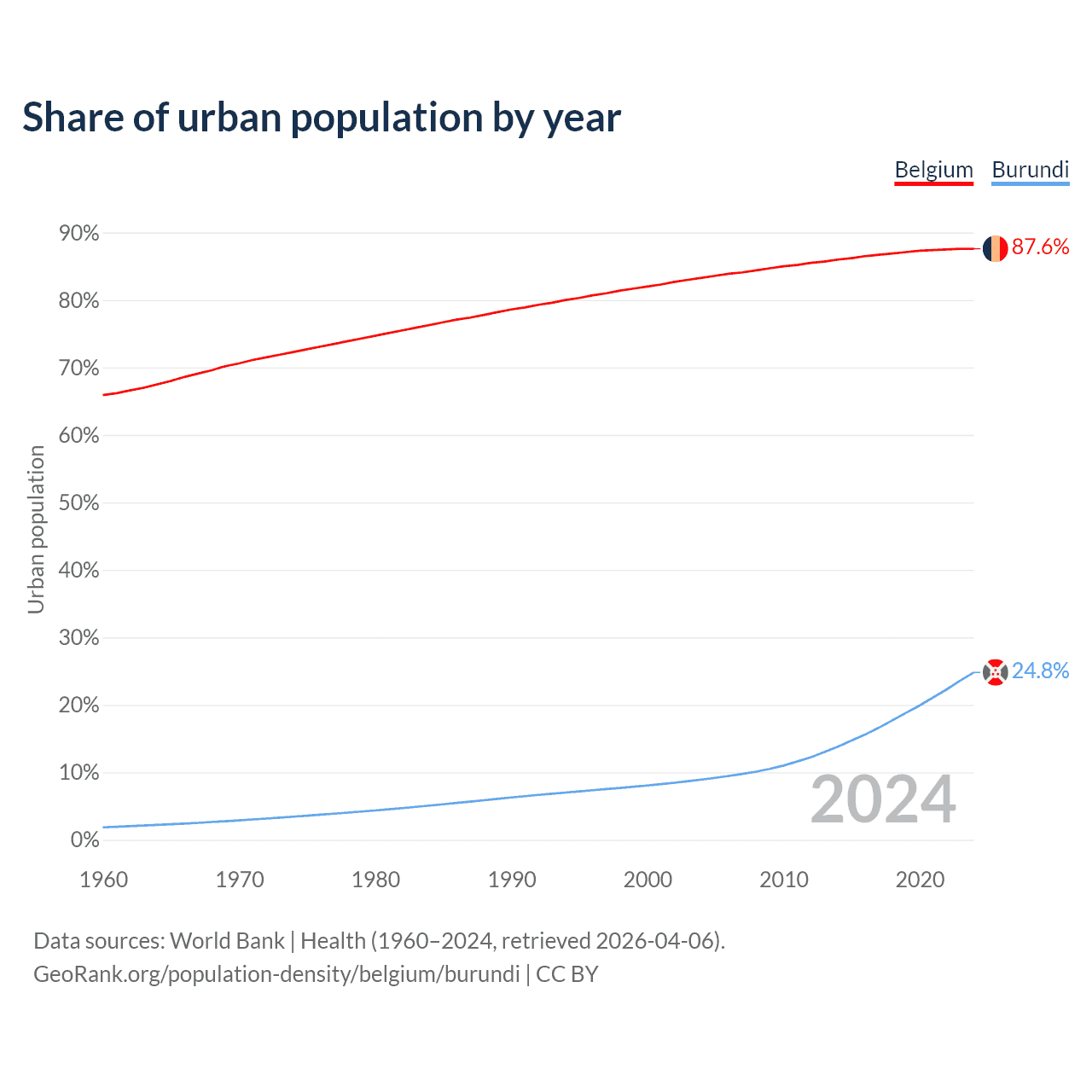 From 2004 to 2024, the share of urban population changed from 83.3% to 87.6% in Belgium and from 8.92% to 24.8% in Burundi.