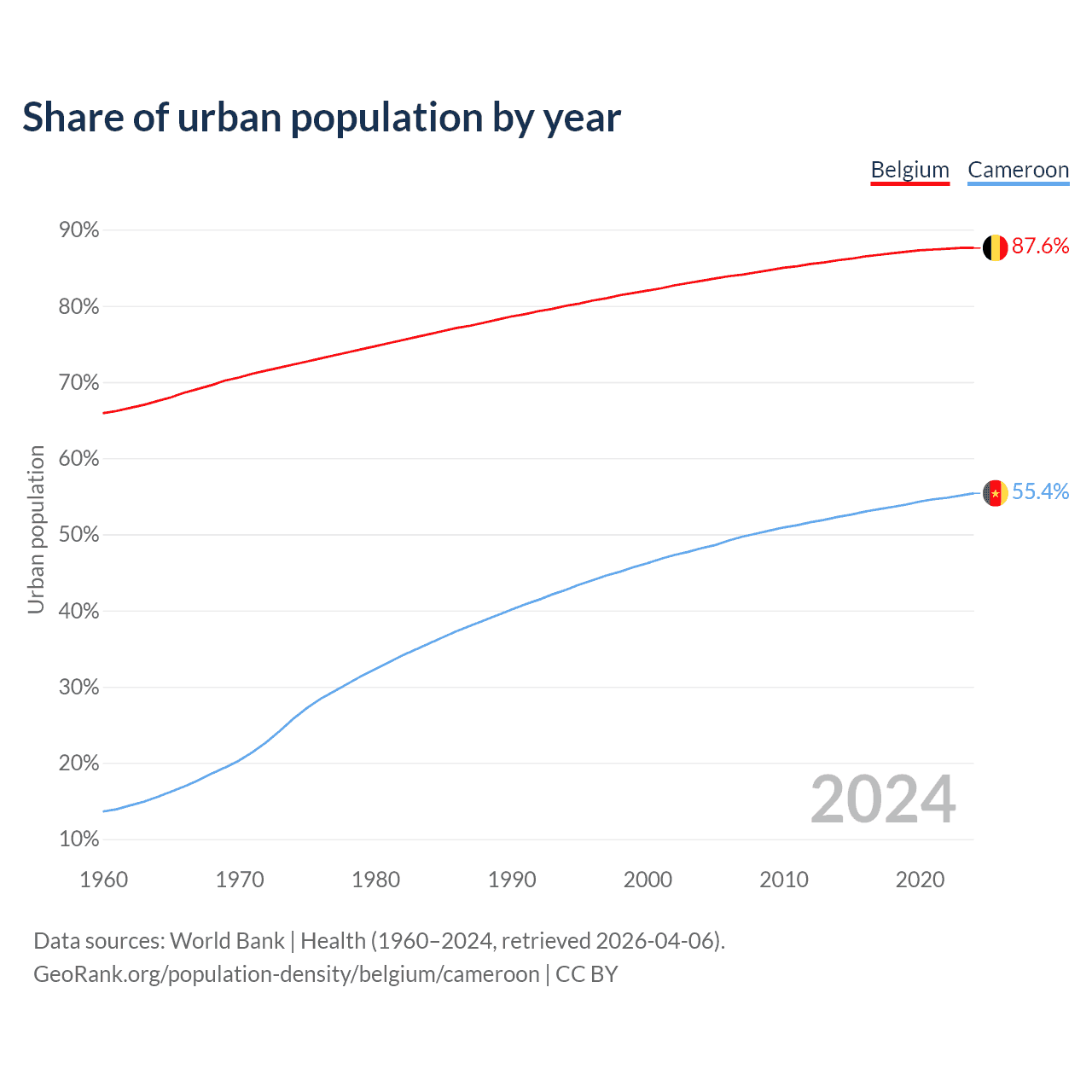 From 2004 to 2024, the share of urban population changed from 83.3% to 87.6% in Belgium and from 48.2% to 55.4% in Cameroon.