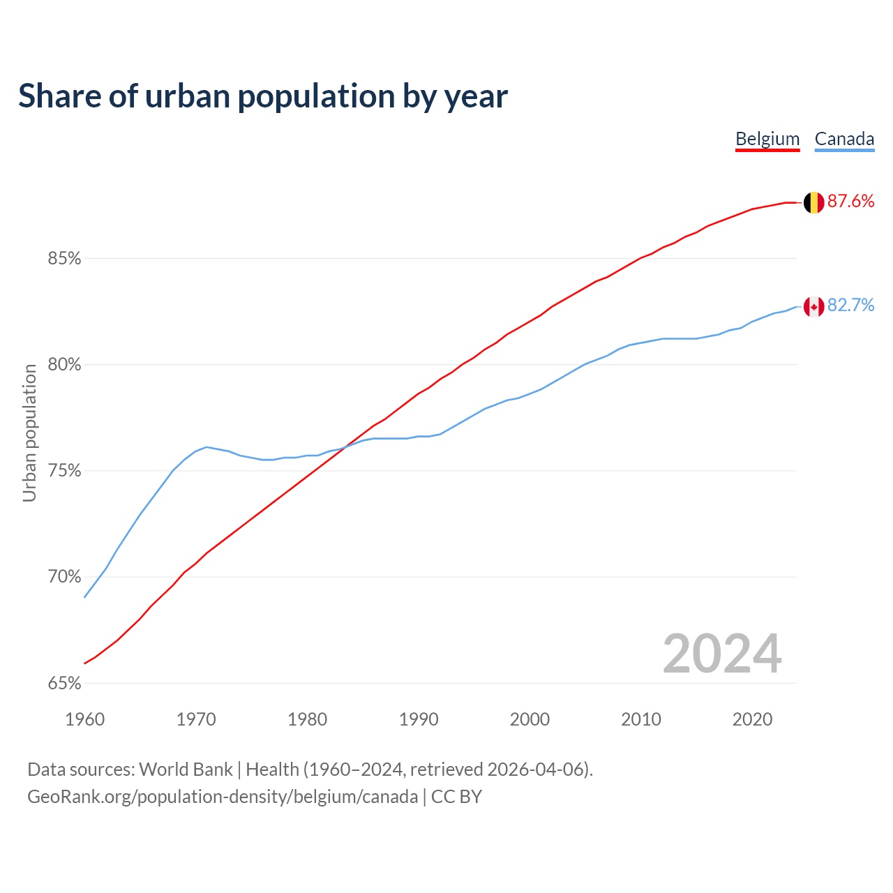 From 2004 to 2024, the share of urban population changed from 83.3% to 87.6% in Belgium and from 79.7% to 82.7% in Canada.