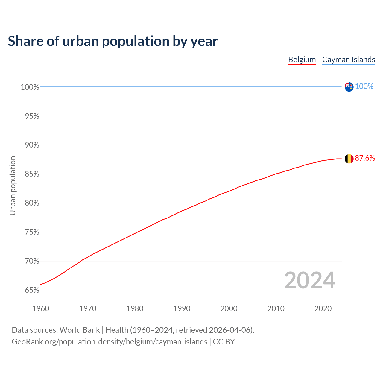 From 2004 to 2024, the share of urban population changed from 83.3% to 87.6% in Belgium and from 100% to 100% in the Cayman Islands.