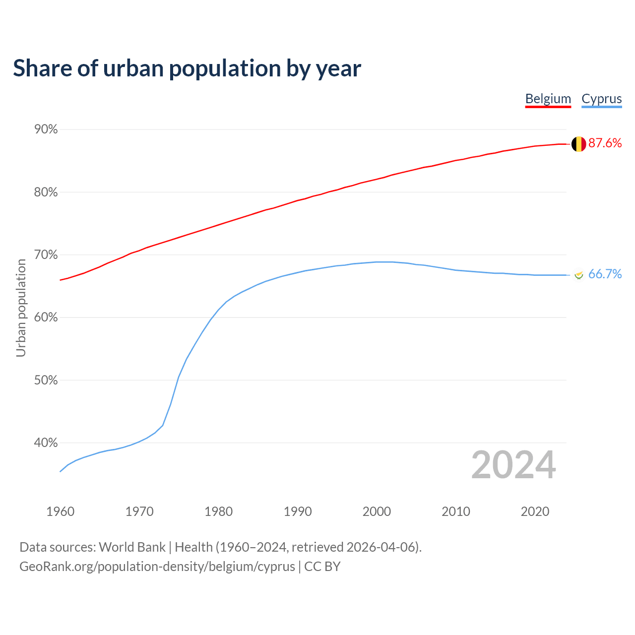 From 2004 to 2024, the share of urban population changed from 83.3% to 87.6% in Belgium and from 68.6% to 66.7% in Cyprus.