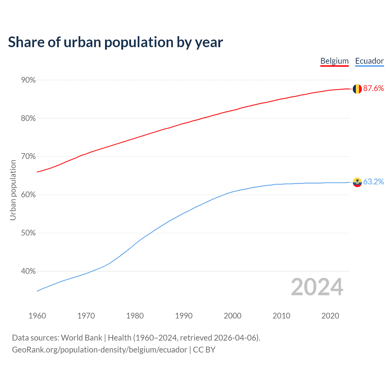 From 2004 to 2024, the share of urban population changed from 83.3% to 87.6% in Belgium and from 61.8% to 63.2% in Ecuador.